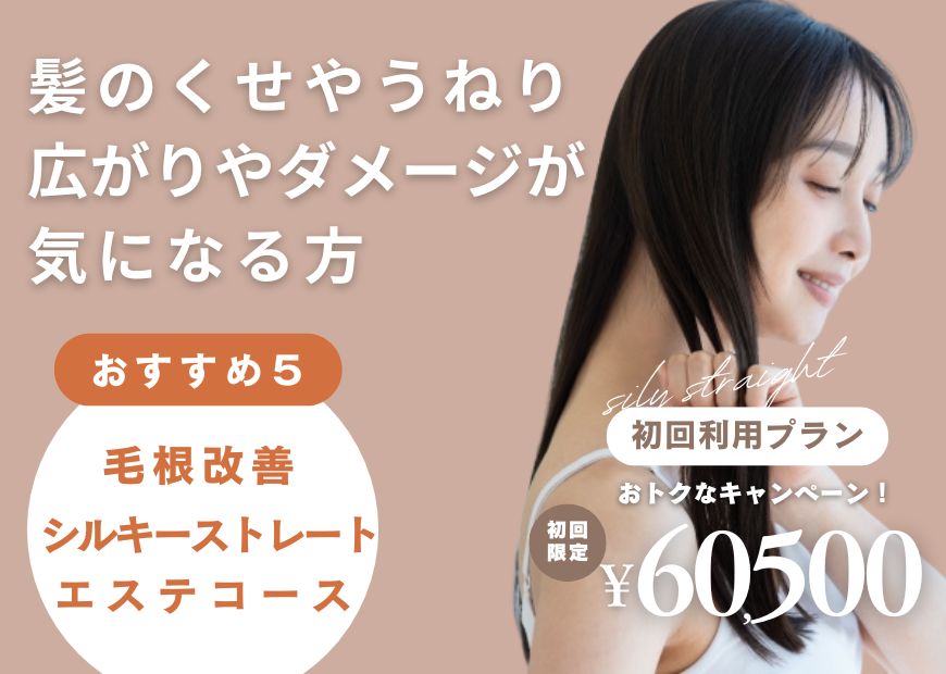 髪のくせやうねり、ダメージした髪にお悩みの方は根改善シルキーストレートエステコースがおすすめです。