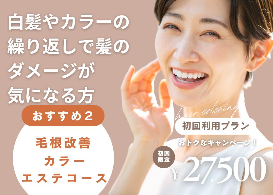 白髪染めやカラーの繰り返しでダメージになった髪や、パサつきが気になる方には毛根改善カラーエステコースがおすすめです♪