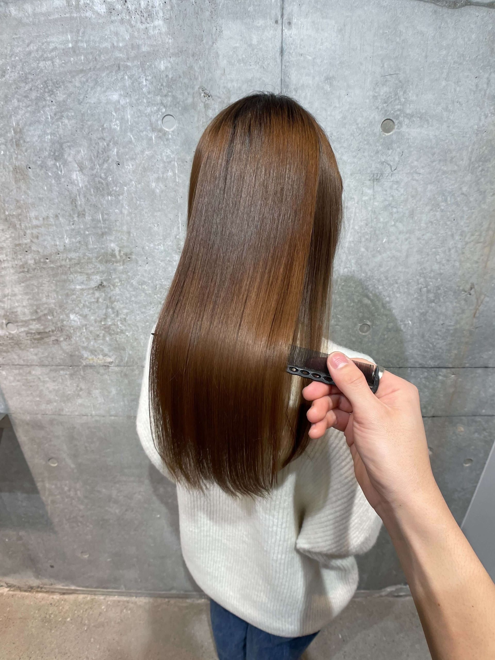 白髪染めの繰り返しで髪がパサつきやすく、乾燥気味で毛先が広がるのが悩みだったので、酸性ストレートをするとこのような仕上がりに。