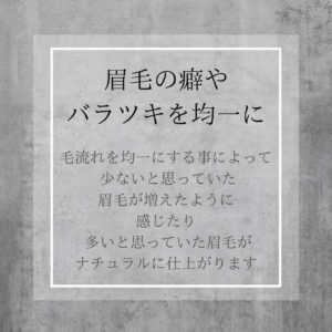 毛流れを均一にする事によって少ないと思っていた眉毛が増えたように感じたり、多いと思っていた眉毛がナチュラルに仕上がります。